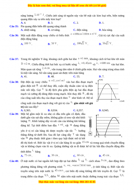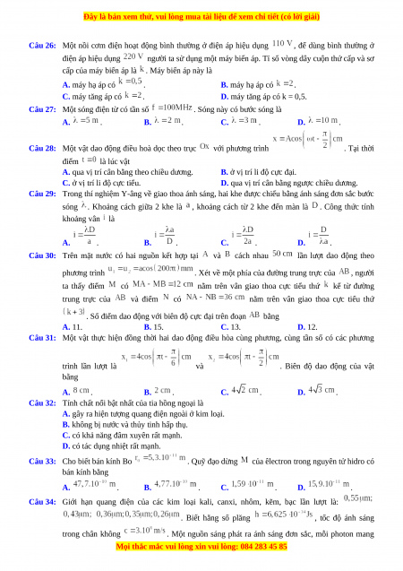 Câu 34: Giới hạn quang điện của các kim loại kali, canxi, nhôm, kẽm, bạc lần lượt là: