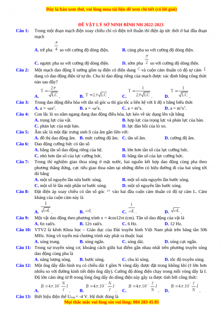 ĐỀ VẬT LÝ SỞ NINH BÌNH NH 2022-2023 Câu 1:
