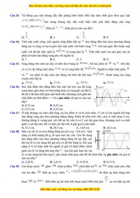 Câu 33: Từ thông qua một khung dây dẫn phẳng biến thiên điều hòa theo thời gian theo quy luật