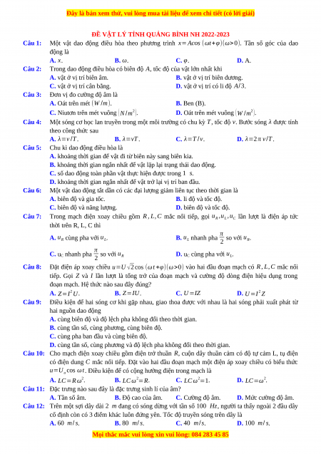 ĐỀ VẬT LÝ TỈNH QUẢNG BÌNH NH 2022-2023 Câu 1: