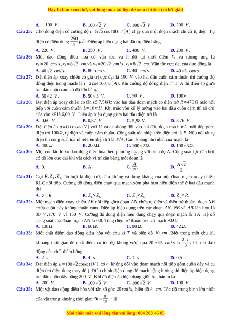 Câu 24: Điện áp hai đầu đoạn mạch u=200 √2 cos (100π t− 2 )(V )¿ tính bằng s¿. Tại thời điểm t1, điện 1