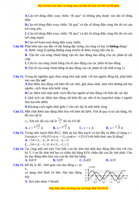 Câu 15. Đồ thị ly độ - thời gian của dao động x1 và x2