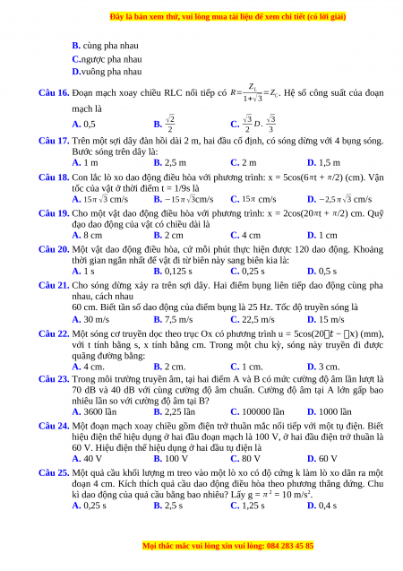 Câu 20. Một vật dao động điều hòa, cứ mỗi phút thực hiện được 120 dao động. Khoảng