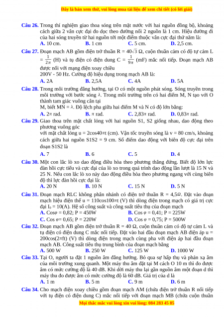 Câu 26. Trong thí nghiệm giao thoa sóng trên mặt nước với hai nguồn đồng bộ, khoảng