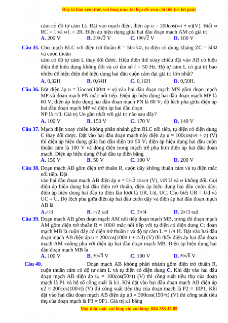 Câu 39. Đoạn mạch AB gồm đoạn mạch AM nối tiếp đoạn mạch MB, trong đó đoạn mạch