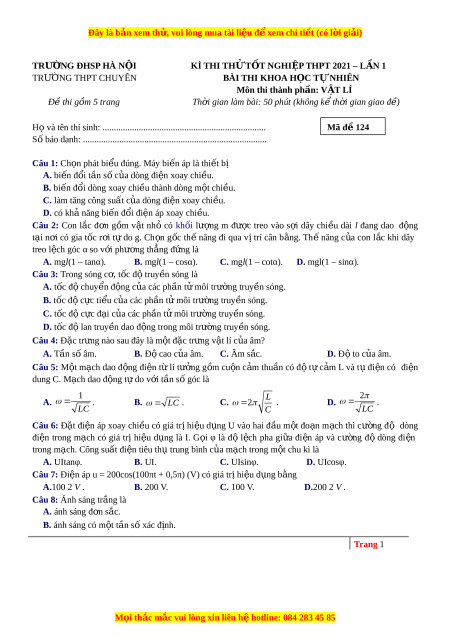 Đề thi thử Vật Lí trường Chuyên ĐH Sư Phạm năm 2021