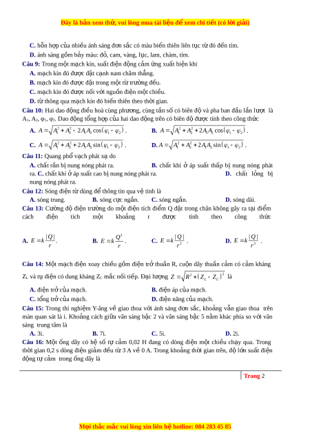 D. từ thông qua mạch kín đó biến thiên theo th i ờ gian. Câu 10: Hai dao đ ng ộ đi u ề hoà cùng phư ng, ơ cùng t n ầ s ố có biên đ ộ và pha ban đ u ầ l n ầ lư t ợ là A1, A2, φ1, φ2. Dao đ ng t ộ ng ổ h p c ợ a ủ hai dao đ ng t ộ rên có biên đ đ ộ ư c ợ tính theo công th c ứ A. 2 2