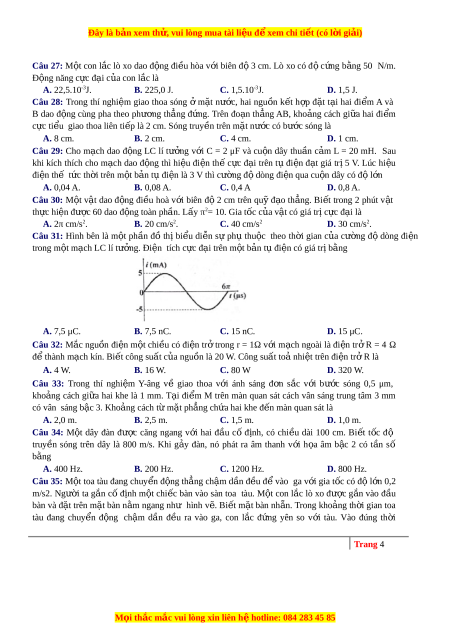 Câu 31: Hình bên là m t ộ ph n ầ đồ thị bi u ể di n ễ sự phụ thu c ộ theo th i ờ gian c a ủ cư ng ờ độ dòng đi n ệ trong m t ộ mạch LC lí tư ng. ở Đi n ệ tích c c ự đại trên m t ộ b n t ả ụ đi n c ệ ó giá tr b ị ng ằ A. 7,5 μC. B. 7,5 nC. C. 15 nC. D. 15 μC. Câu 32: Mắc ngu n ồ đi n ệ m t ộ chi u ề có đi n ệ tr ở trong r = 1Ω v i ớ m c ạ h ngoài là đi n ệ tr ở R = 4 Ω để thành mạch kín. Bi t ế công suất c a ủ ngu n l ồ à 20 W. Công su t ấ to nhi ả t ệ trên đi n ệ tr R l ở à A. 4 W. B. 16 W. C. 80 W D. 320 W.