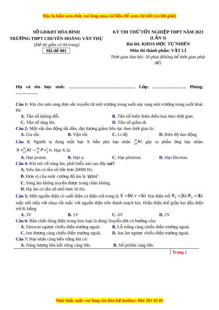 TRƯỜNG THPT CHUYÊN HOÀNG VĂN THỤ (L N Ầ 3) (Đề thi g m ồ có 04 trang) Bài thi: KHOA H C Ọ T N Ự HIÊN Mã đ 001 ề Môn thi thành ph n ầ : V T Ậ LÍ Th i