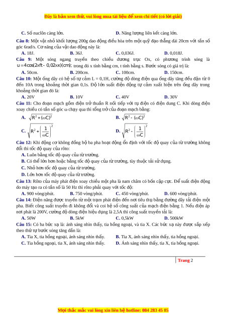 Đây là bản xem th , vu ử i lòng mua tài li u ệ đ xe ể m chi ti t ế (có l i ờ gi i ả ) C. S nuc ố lôn càng l n. ớ D. Năng lư ng ơ liên k t ê càng l n. ớ Câu 8: M t ô vât nhỏ kh i ố lư ng ơ 200g dao đ ng ô đi u ề hòa trên m t ô quỹ đ o a th ng ẳ dài 20cm v i ớ tần số góc 6rad/s. Cơ năng c a ủ vât dao đ ng nà ô y là: A. 18J. B. 36J. C. 0,036J. D. 0,018J. Câu 9: M t ô sóng ngang truy n ề theo chi u ề dư ng ơ tr c u Ox, có phư ng ơ trình sóng là u 4 cos(2 f t 0,02 x