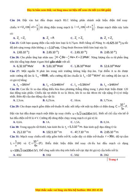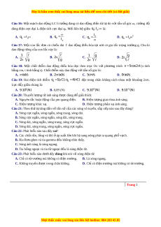 a h RLC không phân nhánh m t ô hi u ệ đi n ệ th ê xoay chiều u U cos t thì dòng đi n ệ trong m c a h là i I cos t . Đoan mach đi n ệ này luôn 0 3 0 3 có: A. Z Z B. Z R C. Z Z D. Z Z L C L L C L C Câu 25: Gi i ớ h n a quang đi n ệ c a ủ m t ô kim lo i a là 0,75μm. Bi t ê h ng ằ số Plăng 34 h 6 ,625.10 J.s, t c ố đ á