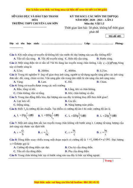 Đề thi thử Vật Lí trường Chuyên Lam Sơn năm 2021