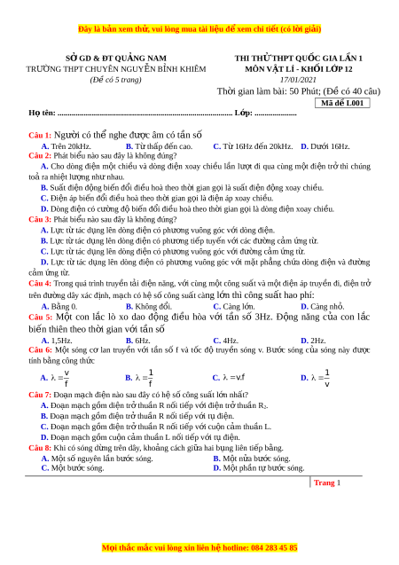 Đây là bản xem th , vu ử i lòng mua tài li u ệ đ xe ể m chi ti t ế (có l i ờ gi i ả ) SỞ GD & ĐT QU N Ả G NAM THI TH Ử THPT QU C Ố GIA L N Ầ 1 TR N ƯỜ G THPT CHUYÊN NGUY N Ễ B N Ỉ H KHIÊM MÔN V T Ậ LÍ - KH I Ố L P Ớ 12 (Đề có 5 trang) 17/01/2021 Th i