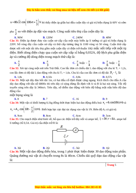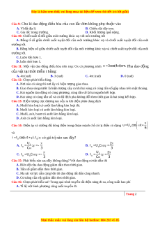 ả ngồi cách màn hình xa nh t ấ là A. 2,0m B. 1,0m C. 1,5m D. 0,5m 0,2 Câu 29: Đặt m t ộ đi n ệ áp xoay chi u ề vào hai đ u ầ cu n ộ dây ch ỉcó đ ộ tự c m ả L H thì cư ng ờ độ dòng đi n ệ qua cu n ộ dây có bi u ể th c ứ i 4 2.cos 100 t A. Bi u ể th c ứ nào sau đây là đi n ệ áp ở 6 hai đầu đo n m ạ ch? ạ A. u 8 0 2.cos 100 t V B. u 8 0.cos 100 t V 3 3 2 C. u 8 0 2.cos 100 t V D. u 8 0.cos 100 t V 3 3 Câu 30: M t ộ đoạn m c ạ h đi n ệ xoay chi u ề g m ồ m t ộ t ụ đi n ệ có dung kháng Z 5 0 và m t ộ cu n ộ dây C mắc n i ố ti p. ế Khi đ t ặ vào hai đ u ầ đo n ạ m c ạ h trên m t ộ đi n ệ áp xoay chi u ề có bi u ể th c ứ Trang 4 M i ọ thắc m c