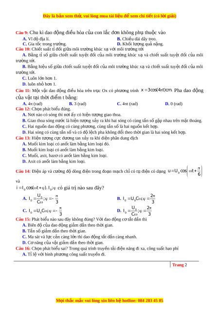 D. Hai sóng có cùng tần s và ố có đ l ộ c ệ h pha không đ i ổ theo th i ờ gian là hai sóng k t ế h p. ợ Câu 13: Hi n t ệ ư ng ợ c c ự dư ng t ơ an x y ra ả khi di n phâ ệ n dung d c ị h A. Mu i ố kim loại có an t ố làm b ng ki ằ m lo i ạ đó. B. Mu i ố kim lo i ạ có an t ố làm b ng ki ằ m lo i ạ . C. Mu i ố , axit, baz c ơ ó an t ố làm b ng ki ằ m lo i ạ . D. Axit có an t ố làm b ng ki ằ m lo i ạ . Câu 14: Đi n ệ áp và cư ng ờ đ ộ dòng đi n ệ trong đo n ạ m c ạ h ch ỉcó t ụ đi n ệ có d ng ạ u U cos t 0 6 và i I