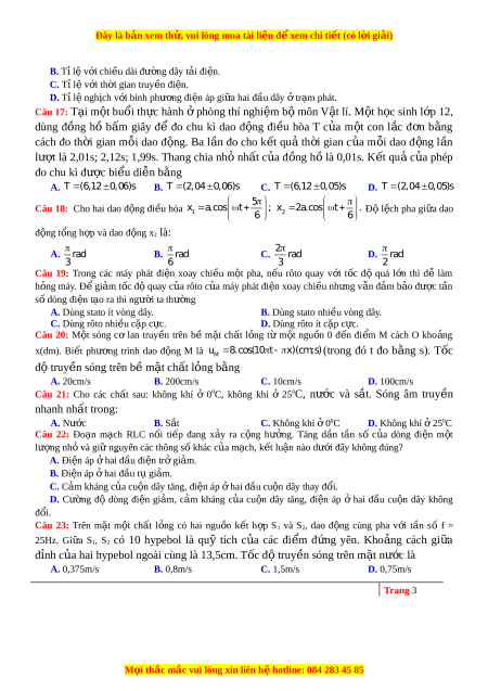 Đây là bản xem th , vu ử i lòng mua tài li u ệ đ xe ể m chi ti t ế (có l i ờ gi i ả ) B. T l ỉ ệ v i ớ chiều dài đư ng ờ dây tải đi n. ệ C. Tỉ l v ệ i ớ th i ờ gian truy n đi ề n. ệ D. Tỉ l ngh ệ c ị h v i ớ bình phư ng đi ơ n ệ áp gi a ữ hai đầu dây t ở rạm phát. Câu 17: T i ạ m t ộ bu i ổ th c ự hành ở phòng thí nghi m ệ b m ộ ôn V t ậ lí. M t ộ h c ọ sinh l p 12, ớ dùng đồng hồ b m