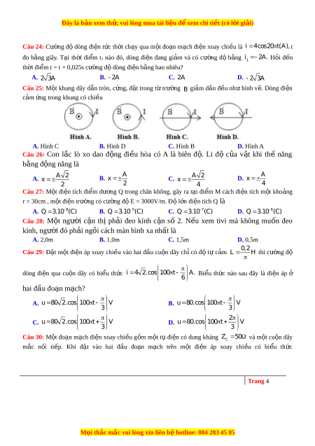 Đây là bản xem th , vu ử i lòng mua tài li u ệ đ xe ể m chi ti t ế (có l i ờ gi i ả ) Câu 24: Cư ng ờ độ dòng đi n ệ t c ứ th i ờ ch y ạ qua m t ộ đo n ạ m c ạ h đi n ệ xoay chi u ề là i 4 cos20 t (A), t đo bằng giây. T i ạ th i ờ đi m ể t1 nào đó, dòng đi n ệ đang gi m ả và có cư ng ờ độ b ng ằ i 2A. H i ỏ đ n ế 1 th i ờ đi m ể t = t + 0,025s cư ng ờ đ dòng đi ộ n b ệ ằng bao nhiêu?