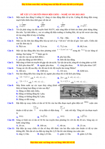 ĐỀ VẬT LÝ CHUYÊN PHAN BỘI CHÂU – NGHỆ AN NH 2022-2023 Câu 1: