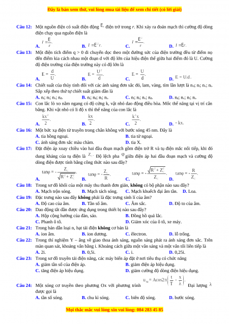Câu 24: Một sóng cơ truyền theo phương Ox với phương trình Đại lượng được gọi là A. tần số sóng. B. chu kì sóng. C. biên độ sóng. D. bước sóng.