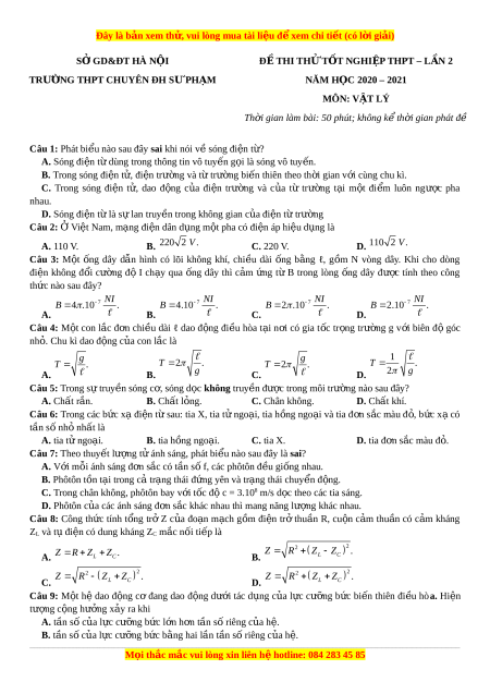 Đề thi thử Vật Lí trường Chuyên Sư Phạm năm 2021