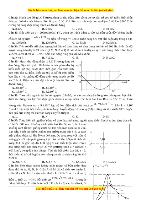 ề trong chân không có bư c ớ sóng 589 nm. L y ấ h = 6,625.10-34 J.s, c = 3.108 m/s. Lư ng t ợ nă ử ng lư ng c ợ a ủ ánh sáng này là A. 3,37.10-19 J. B. 3,37.10-28 J. C. 1,30.10-28 J. D. 1,30.10-19 J. Câu 20: M t ộ mạch dao đ ng ộ LC lí tư ng ở g m ồ t ụ đi n ệ và cu n ộ c m ả thu n ầ đang th c ự hi n ệ dao đ ng ộ đi n ệ từ tự do. Dòng đi n ệ trong m c ạ h có bi u ể th c