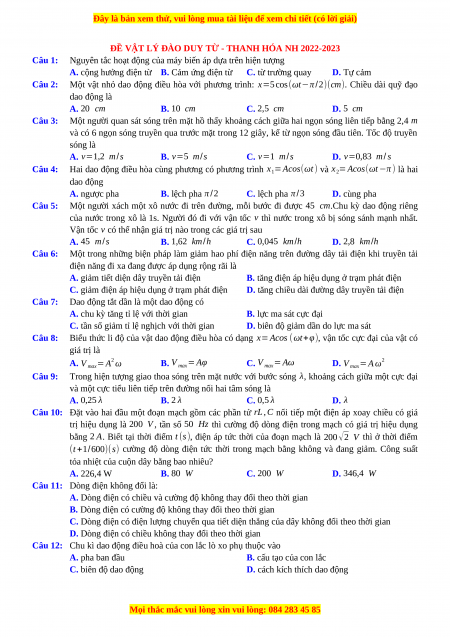 ĐỀ VẬT LÝ ĐÀO DUY TỪ - THANH HÓA NH 2022-2023 Câu 1: