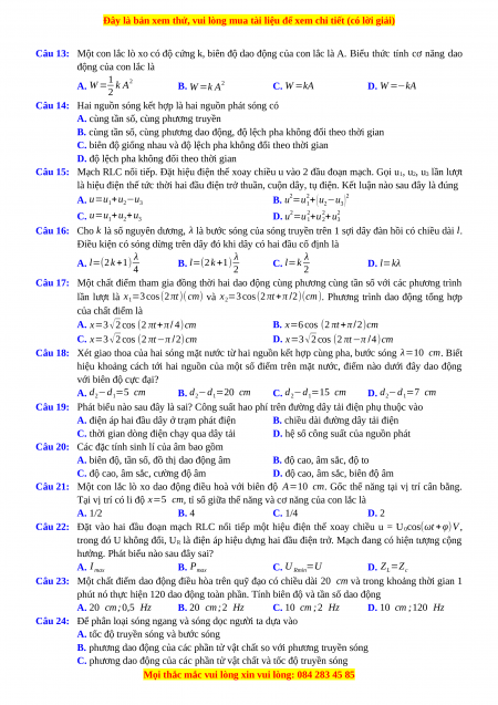 Câu 13: Một con lắc lò xo có độ cứng k, biên độ dao động của con lắc là A. Biểu thức tính cơ năng dao động của con lắc là 1