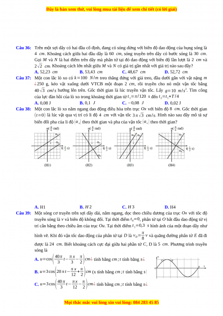 Câu 39: Một sóng cơ truyền trên sợi dây dài, nằm ngang, dọc theo chiều dương của trục