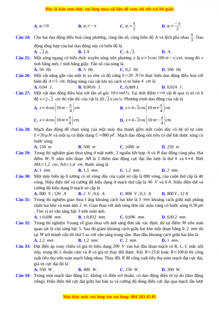 Câu 24: Cho hai dao động điều hoà cùng phương, cùng tần số, cùng biên độ A và lệch pha nhau . Dao 3