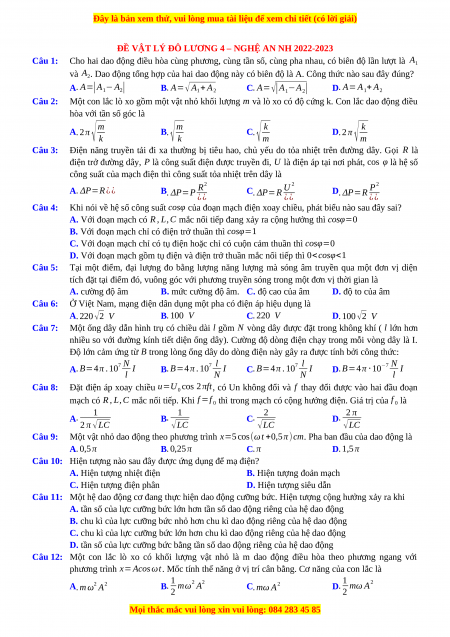 ĐỀ VẬT LÝ ĐÔ LƯƠNG 4 – NGHỆ AN NH 2022-2023 Câu 1: