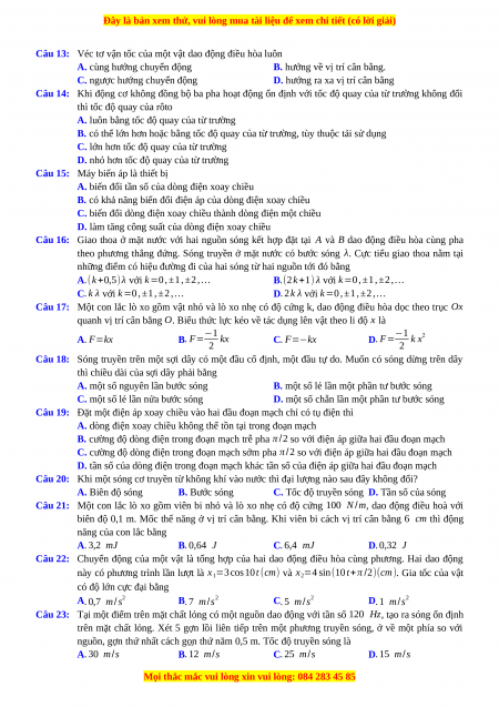 Câu 18: Sóng truyền trên một sợi dây có một đầu cố định, một đầu tự do. Muốn có sóng dừng trên dây