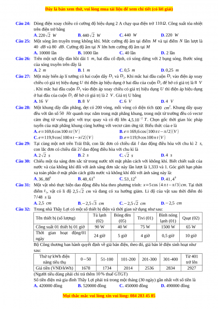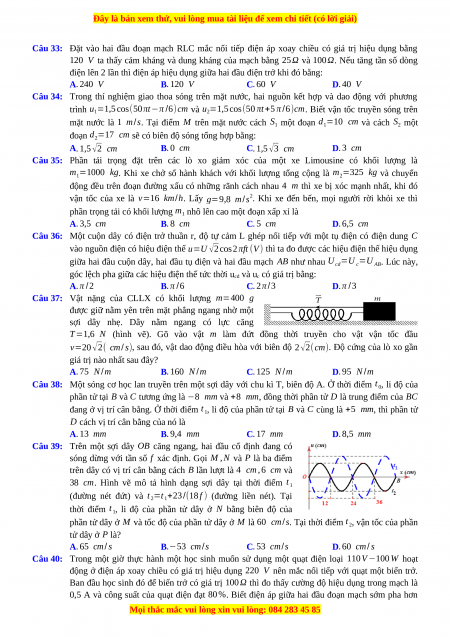 Câu 20: Khi một sóng cơ truyền từ không khí vào nước thì đại lượng nào sau đây không đổi? A. Biên độ sóng B. Bước sóng