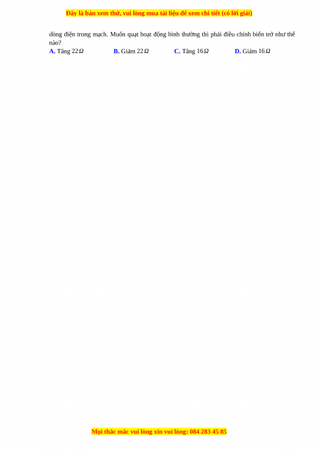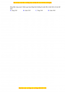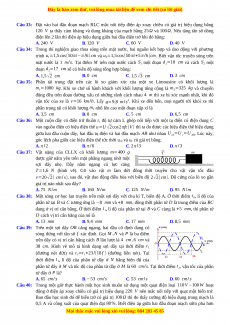 mạch có R , L, C mắc nối tiếp. Khi f =f 0 thì trong mạch có cộng hưởng điện. Giá trị của f 0 là 1 1 2 2 π A. B. C. D. 2 π √LC √LC √LC √LC Câu 9: