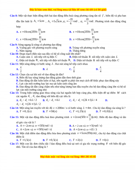 Câu 8: Một vật thực hiện đồng thời hai dao động điều hoà cùng phương cùng tần số f , biên độ và pha ban đầu lần lượt là A 5 cm rad rad 1 , A 5 3cm , ,