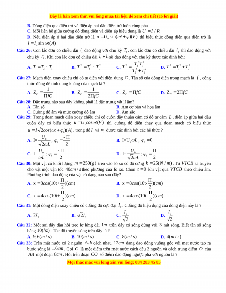 Câu 25: Điều nào sau đây là đúng khi nói về đoạn mạch xoay chiều chỉ có điện trở thuần?