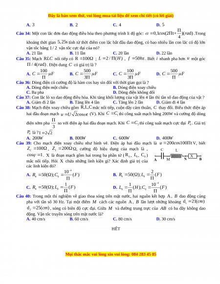 Câu 40: Trong một thí nghiệm về giao thoa sóng trên mặt nước, hai nguồn kết hợp