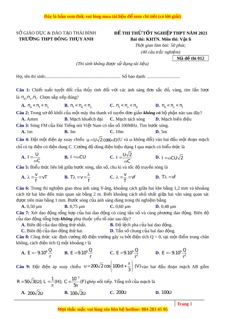 Đây là bản xem th , vu ử i lòng mua tài li u ệ đ xe ể m chi ti t ế (có l i ờ gi i ả ) S G Ở IÁO D C & Ụ ĐÀO T O Ạ THÁI BÌNH Đ Ề THI TH Ử TỐT NGHI P Ệ THPT NĂM 2021