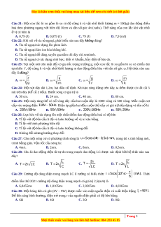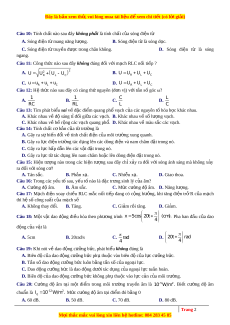 B. Mạch khuếch đại C. Mạch tách sóng D. Mạch biến đi u ệ Câu 3: Sóng FM c a ủ Đài Ti ng ế nói Vi t ệ Nam có t n s ầ 100M ố Hz. Tim bư c ớ sóng. A. 1m B. 3m C. 10m D. 5m Câu 4: Đặt m t ộ đi n ệ áp xoay chi u ề u U 2cos( t )(U và ω không đ i ổ ) vào hai đ u ầ m t ộ đo n ạ mạch ch c ỉ ó t đi ụ n ệ có đi n dung ệ C. Cư ng ờ đ dòng đi ộ n hi ệ u ệ d ng I qua ụ mạch có bi u t ể h c ứ là U A. I B. I C U C. U 2 I D. I C U 2 C C Câu 5: Biểu th c ứ liên h gi ệ a ữ bư c ớ sóng, t n s ầ , c ố hu ki và t c ố đ t ộ ruy n ề sóng là v v A. vT B. T v C. v f D. T v f f f T
