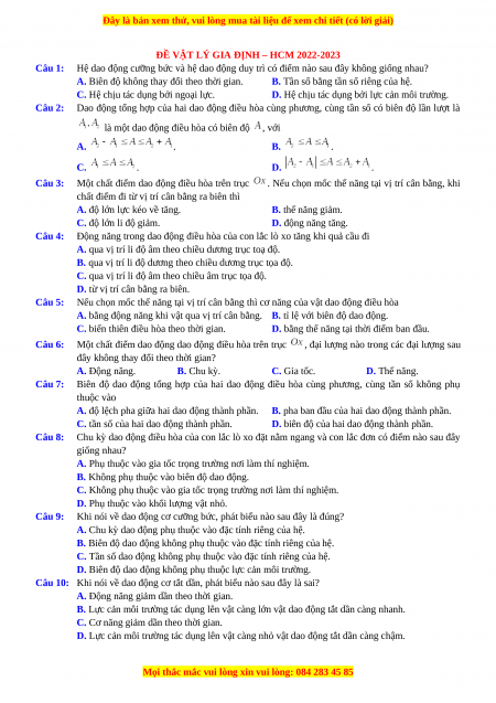ĐỀ VẬT LÝ GIA ĐỊNH – HCM 2022-2023 Câu 1: