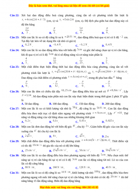 Câu 22: Xét hai dao động điều hoà cùng phương, cùng tần số có phương trình lần lượt là (cm, s) và