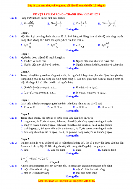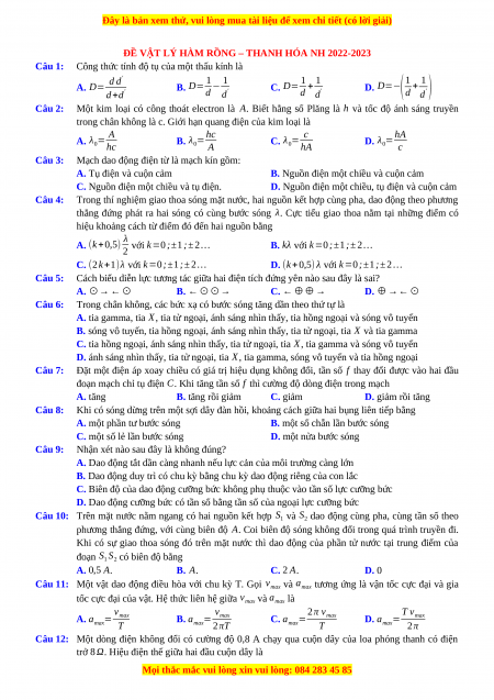 ĐỀ VẬT LÝ HÀM RỒNG – THANH HÓA NH 2022-2023 Câu 1: