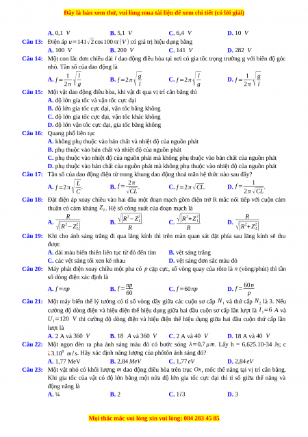 Câu 13: Điện áp u=141√2 cos100 πt (V ) có giá trị hiệu dụng bằng A. 100 V B. 200 V C. 141 V D. 282 V