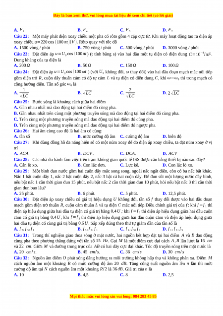 Câu 22: Một máy phát điện xoay chiều một pha có rôto gồm 4 cặp cực từ. Khi máy hoạt động tạo ra điện áp