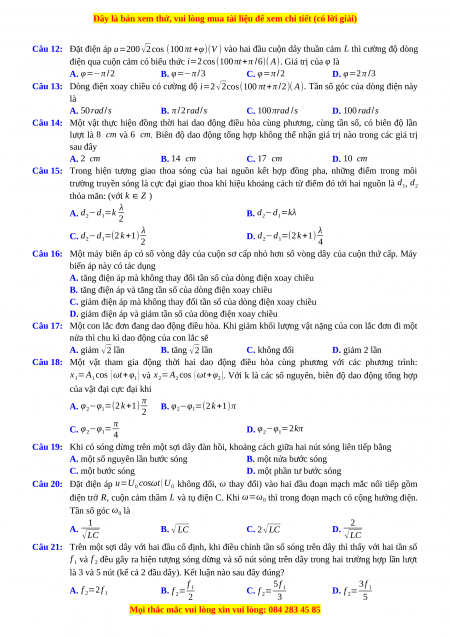 Câu 12: Đặt điện áp u=200 √2 cos (100 πt +φ)(V ) vào hai đầu cuộn dây thuần cảm L thì cường độ dòng
