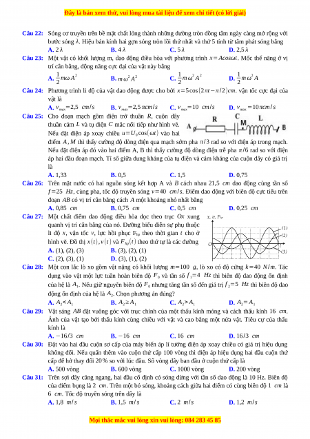 Câu 24: Phương trình li độ của vật dao động được cho bởi x=5 cos (2 πt−π /2)cm. vận tốc cực đại của vật là