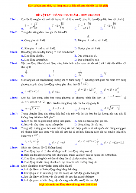 ĐỀ VẬT LÝ HOÀNG HOA THÁM – HCM 2022-2023 Câu 1: