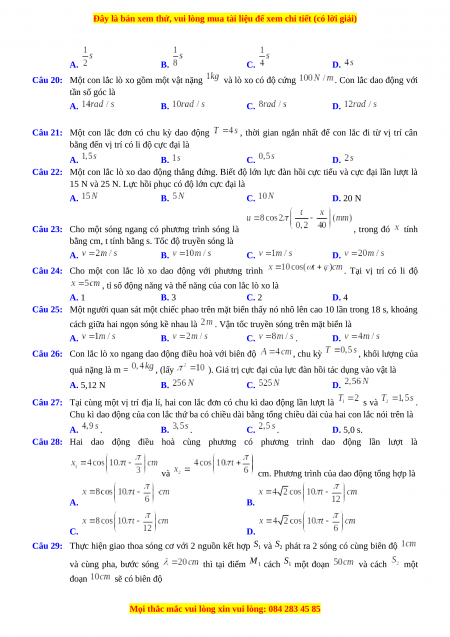 Câu 25: Một người quan sát một chiếc phao trên mặt biển thấy nó nhô lên cao 10 lần trong 18 s, khoảng