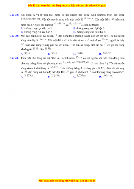 Câu 40: Trên mặt chất lỏng tại hai điểm A, B cách nhau có hai nguồn kết hợp, dao động theo