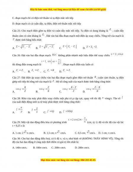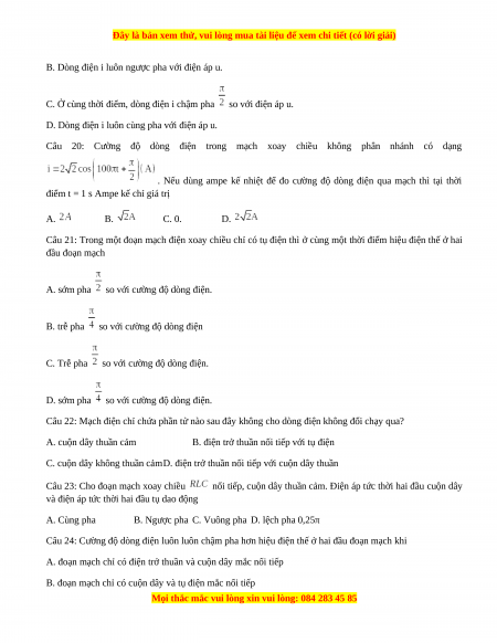 Câu 24: Cường độ dòng điện luôn luôn chậm pha hơn hiệu điện thế ở hai đầu đoạn mạch khi