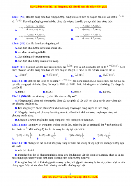 Câu 7. (NB) Hai dao động điều hòa cùng phương, cùng tần số có biên độ và pha ban đầu lần lượt là và